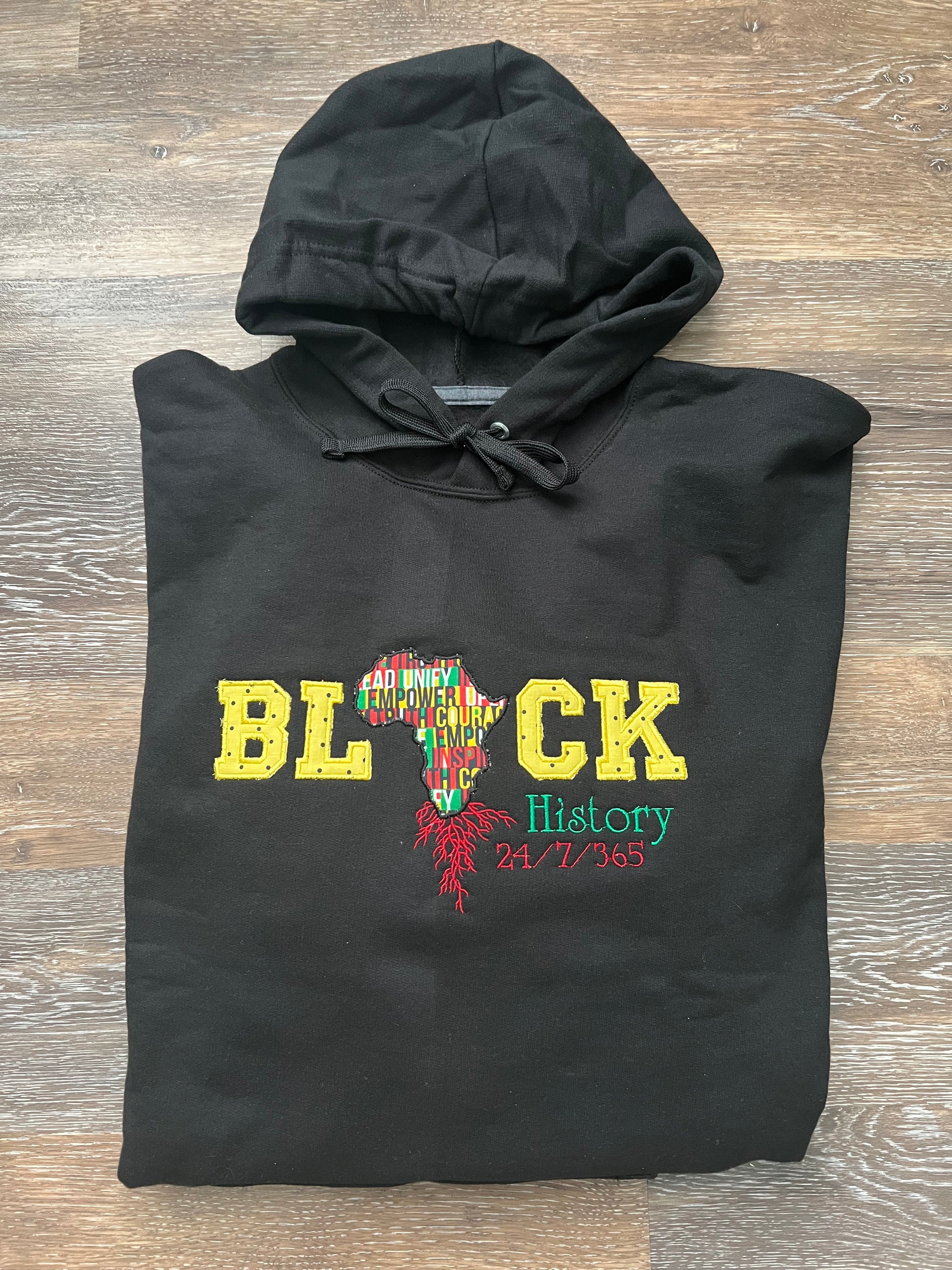 Black History hoodie appliqued with African print fabric and embroidered letters.