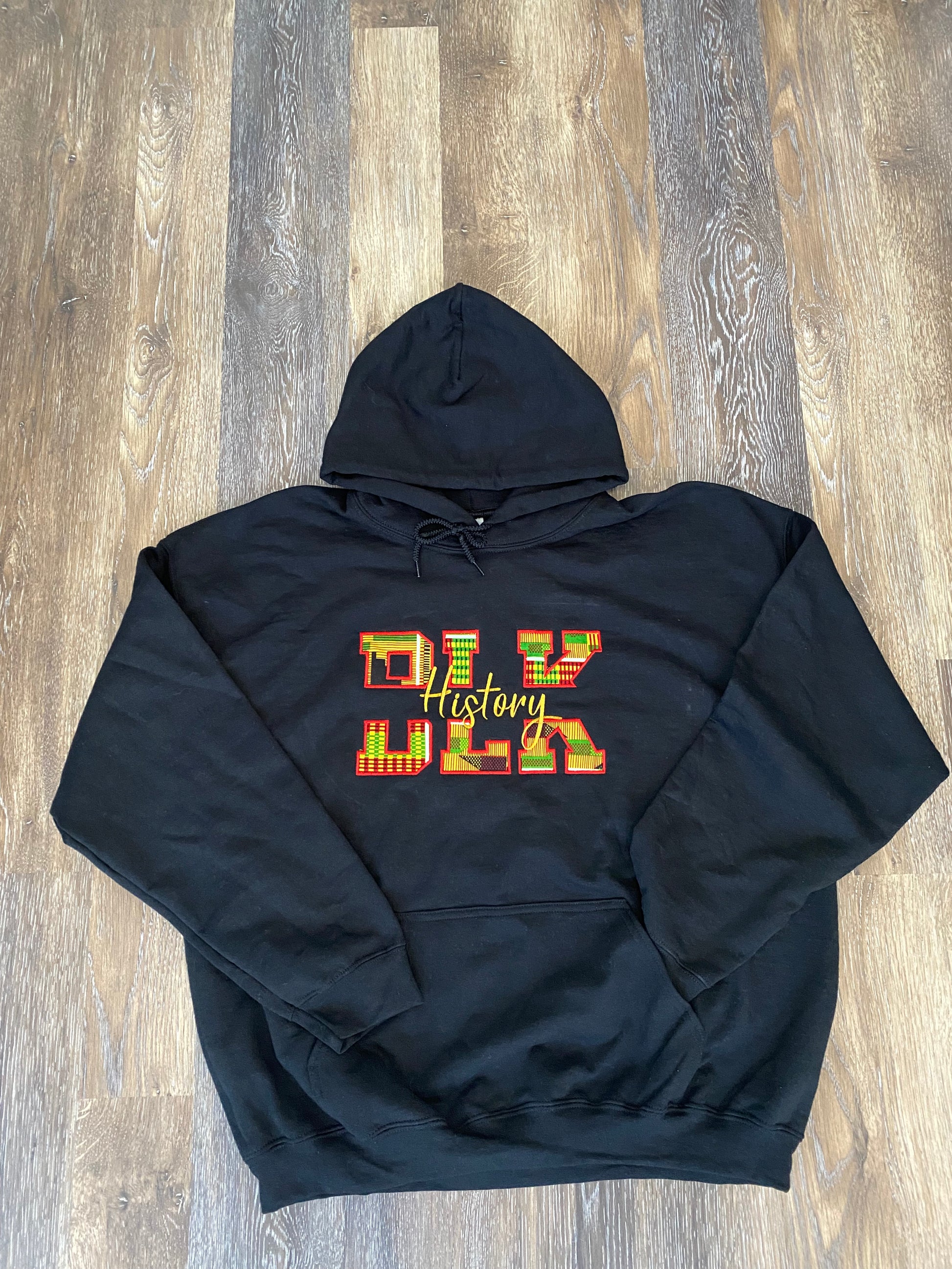 Black History Hoodie with Split Letters and African Patterned Fabric