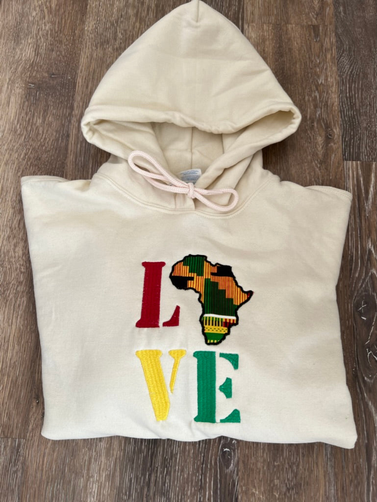 LOVE hoodies with Africa appliquéd with African print fabric and embroidered letters.